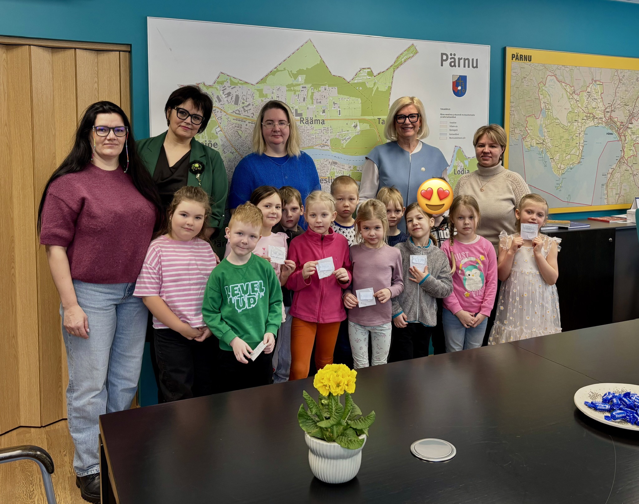 Linnapea Kristel Voltenberg võttis meid vastu väga soojalt ja sõbralikult. Ta tutvustas oma tööd ning näitas lastele linnapea ametiketti, mis oli paljude jaoks kohtumise kõige oodatum hetk. Lapsed said ketti ka ise kaela proovida ning tunda, kui uhke ja vastutusrikas see amet on. Vestluse käigus esitasid lapsed küsimusi, milleks olime varem ühiselt valmistunud. Saime teada, et linnapea armastab väga oma kodulinna, naudib aega lapselapsega ning käib meelsasti koeraga jalutamas. Samuti rääkis ta ausalt, et linnapea tööpäevad on pikad ja vastutusrikkad, kuid ta teeb seda tööd südamega, sest soovib, et Pärnu oleks koht, kus on hea elada ning kus kasvaks palju õnnelikke lapsi.